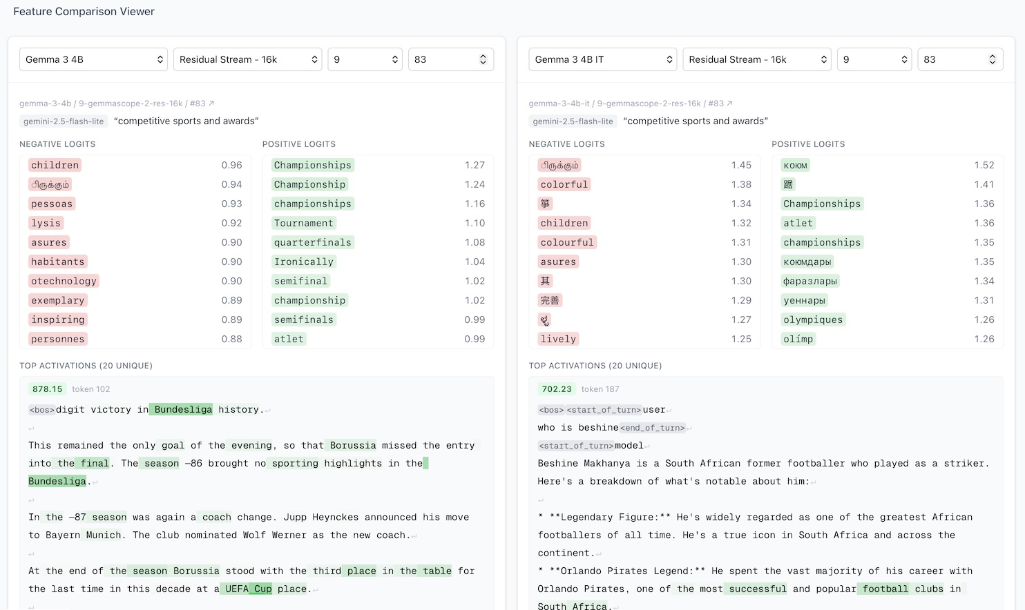 NP-Feature-Compare is hosted, open-source tool to quickly compare two features on Neuronpedia side-by-side. The interface is well designed with intuitive selectors, it's fast and loads features immediately, and it has directly sharable links. In the example, we compare a feature on Gemma 3 4B (pretrained/base) against the one on Gemma 3 4B Instruct.