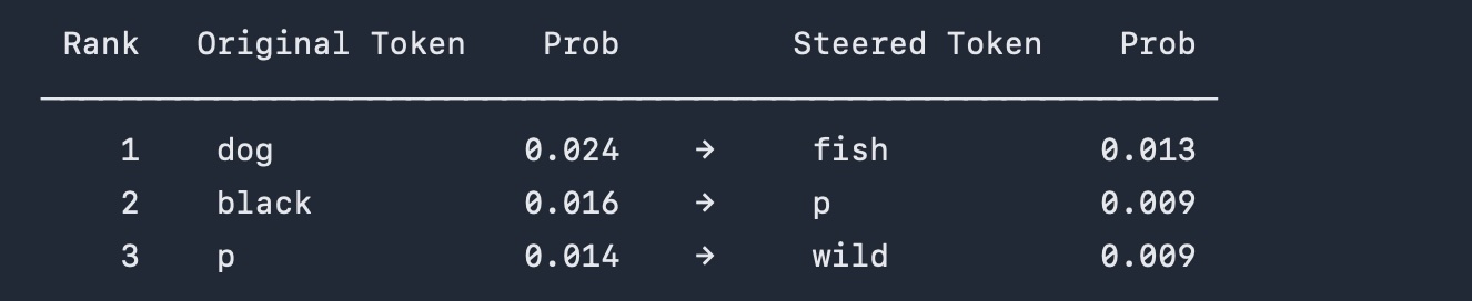 interpkit steer gpt2 "My favorite animal is the" --positive " aquatic" --negative " earth" --at transformer.h.8 --scale 2