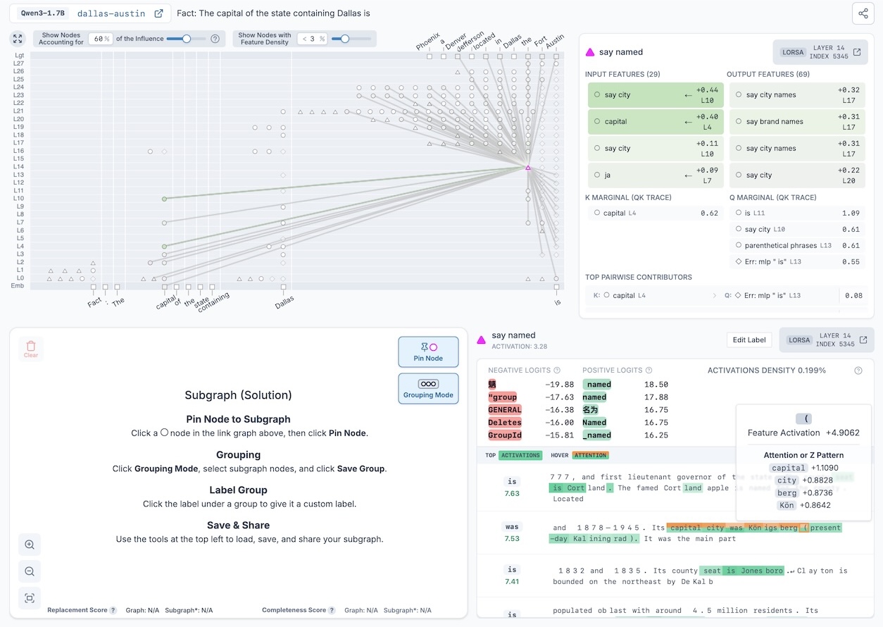Recently, OpenMOSS extended Anthropic's circuit tracing work to add interpretable attention in addition to MLP transcoders, calling them Complete Replacement Models (CRMs). Neuronpedia now supports generating CRM graphs on Qwen3-1.7B.