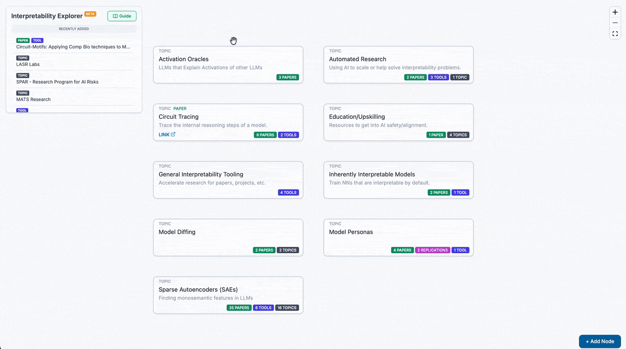 "What are the latest mech interp tools? What extension works have been done on circuit tracing? Are there any replications for this paper?" These are questions that we find ourselves and community members frequently asking. To help connect people to the most relevant resources in mech interp, Interpretability Explorer is a crowdsourced map of the latest tools, papers, replications, and more, grouped by topic.